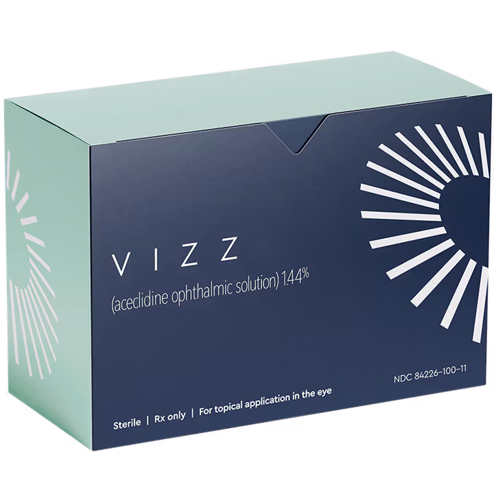 Vizz is a daily prescription eye drop that improves near vision for adults with presbyopia. It works by gently shrinking the pupil — a process called pinhole optics — allowing more of your near field to come into focus without readers for many everyday tasks.